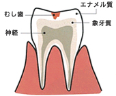 歯の表面はエナメル質で覆われており、むし歯はまずエナメル質に発生します。エナメル質がむし歯になると、光沢がなくなり白っぽくザラザラした感じになります。